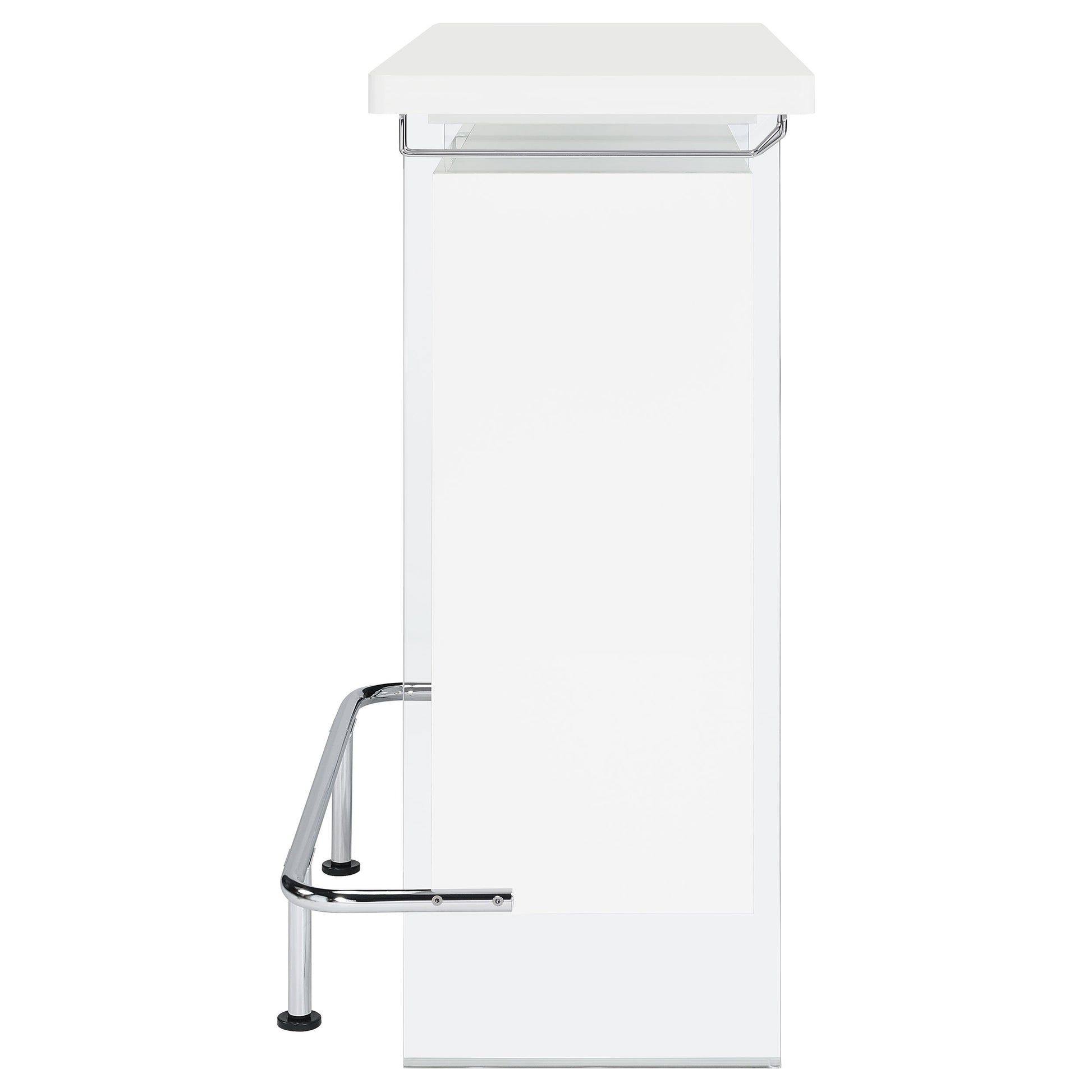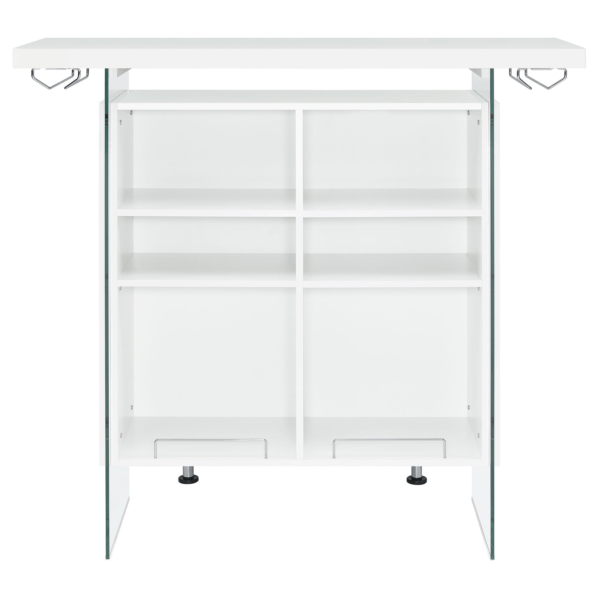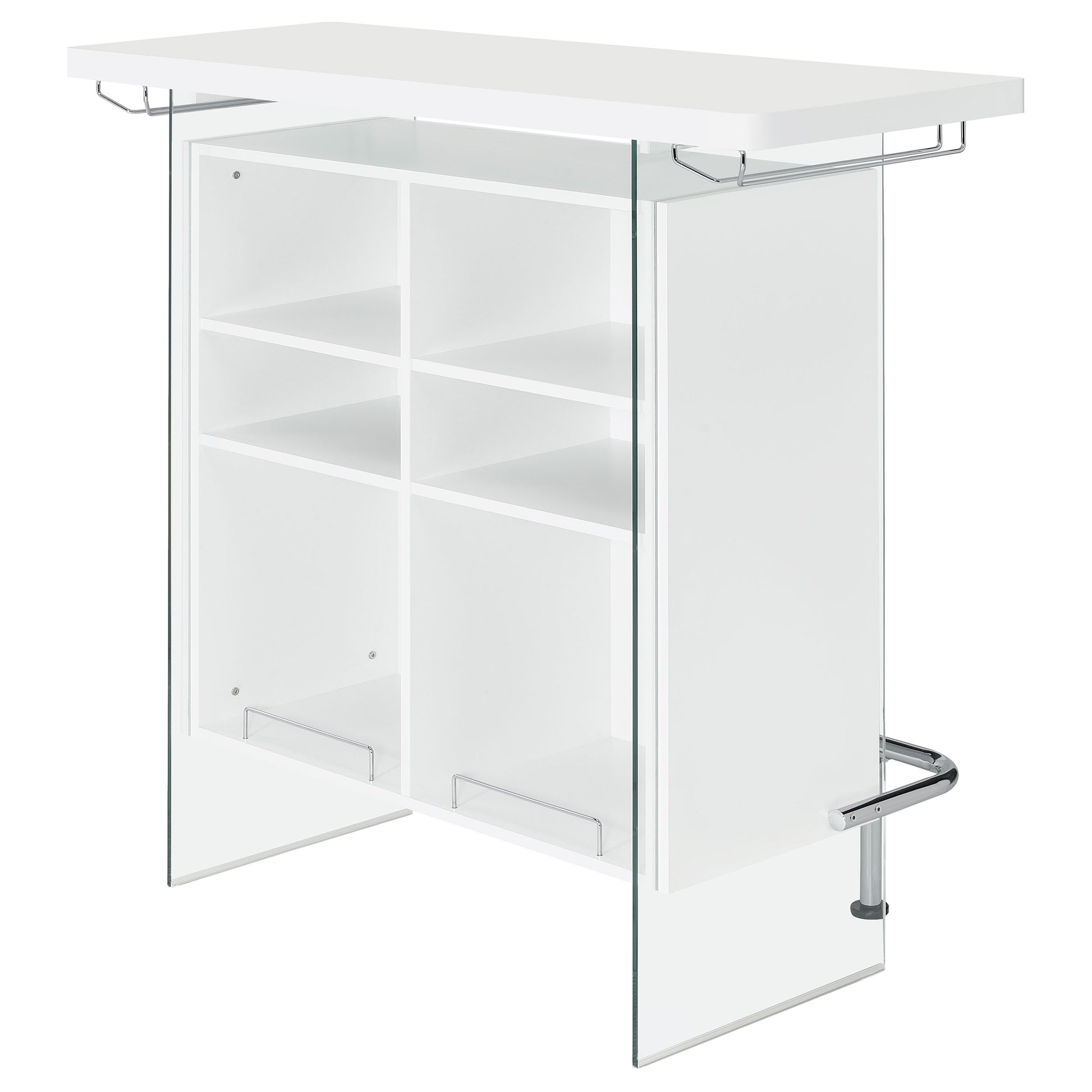 Elevate a multipurpose living room with this modern bar unit. A neutral finish, accented with polished chrome metal accents offers a striking design contrast. Supported and flanked by clear tempered glass side panels, this bar unit boasts ultra-modern elements as well for a dramatic feel. Compact yet highly functional, this bar unit also features ample storage space with six built-in open shelves for storing bottles, serving pieces and other mixologist must-haves. Tucked beneath the bartop along each side is a stemware rack for wine glasses and more.