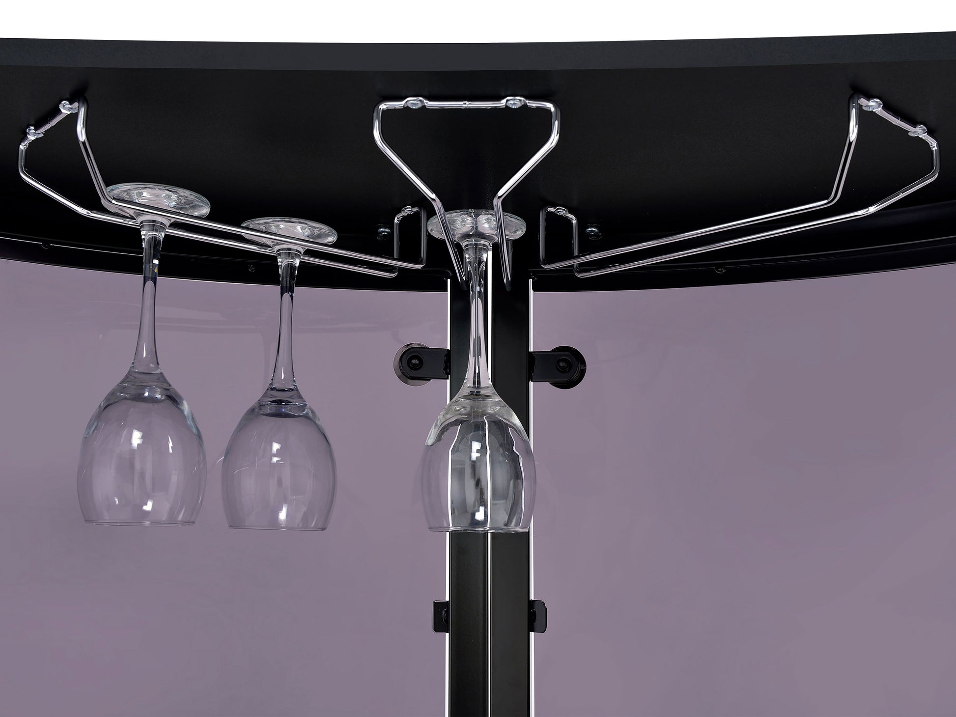 - Contemporary black bar unit with a curved metal frame in a classic black finish
