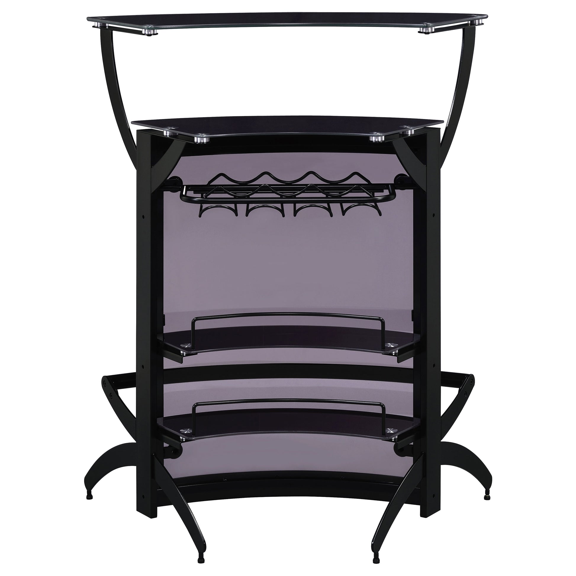 Heavy on the modern elegance scale, the design of this elegant bar unit turns heads as it provides comprehensive serving and entertaining functions. Enjoy a lovely smoked acrylic with black tempered glass and black metal frame, combining to offer a sophisticated ambiance. With two-tier black tempered glass tops and two identical shelves, storage and service are easy. A stemware rack and wine rack holding three bottles creates a perfect setup for intimate gatherings. Entertain in a modern space with the confidence and utility of this exceptional bar unit.
