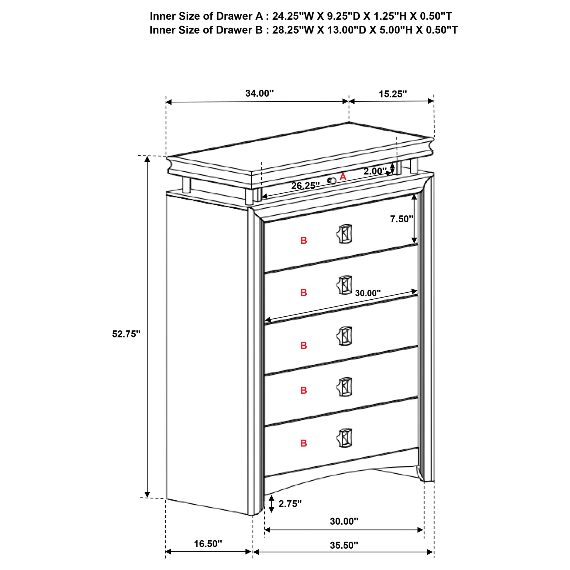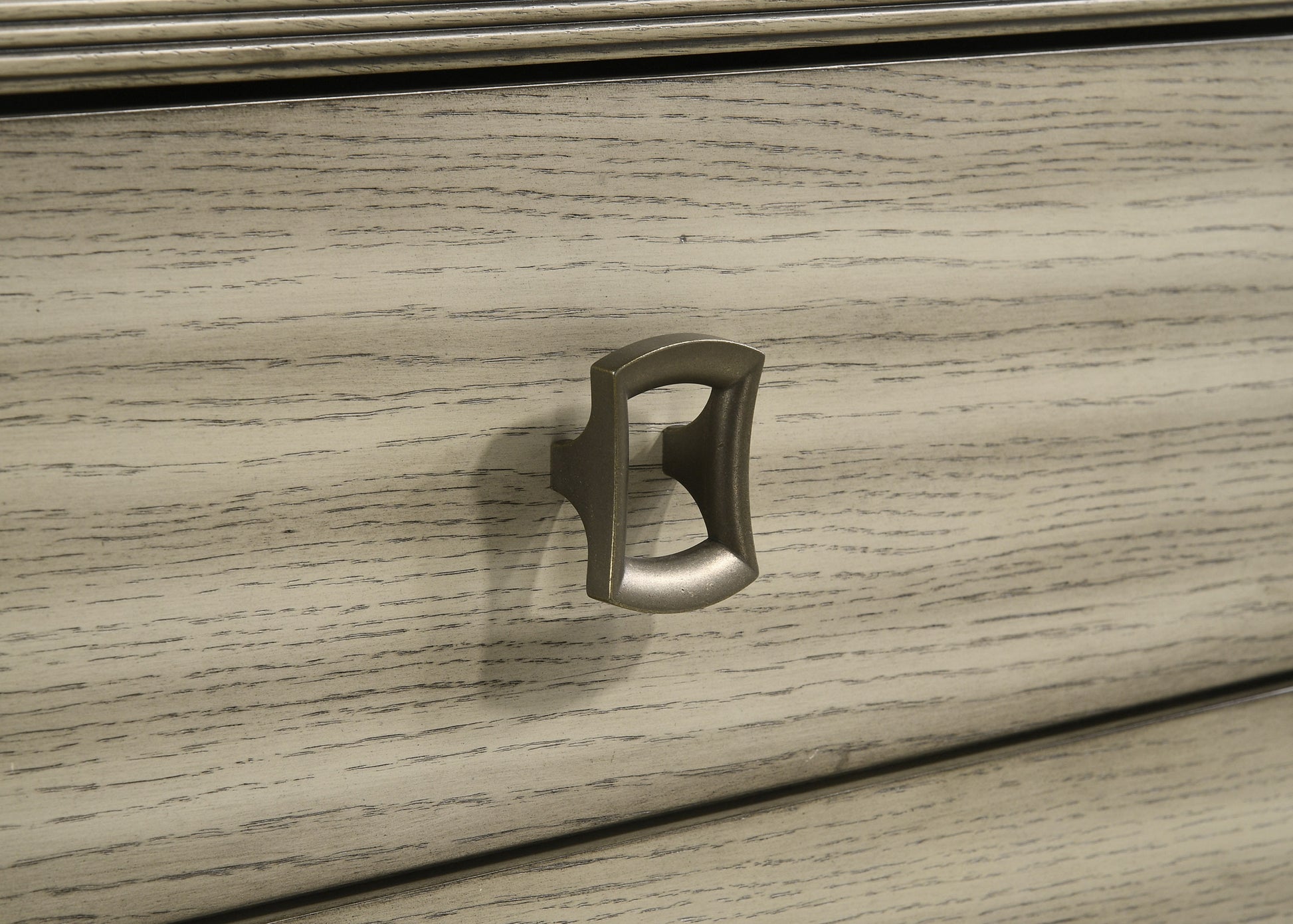 - Distinctive open rectangular hardware complements five larger drawer fronts