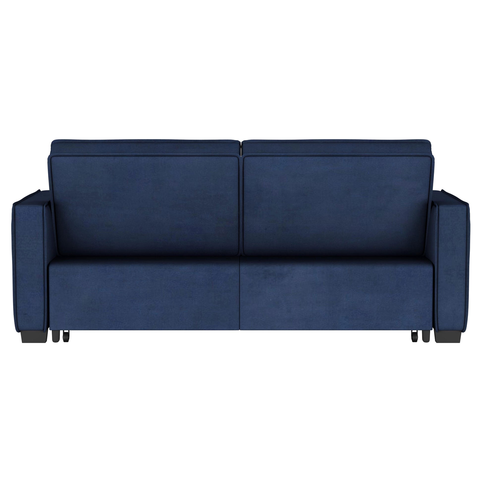 Sink into the plush comfort of a modern sleeper sofa while enjoying a movie or catching up with the family. The sofa easily converts to a bed when guests arrive, offering versatility perfect for a compact living room or multifunctional home office. It shows off navy blue fabric upholstery that's rich and soft, creating an inviting pop of color to anchor surrounding decor. Wide track arms define is simple, streamlined silhouette, with trim details that add a hint of texture. It's a great choice in your den, easily allowing the space to become an occasional guest room.