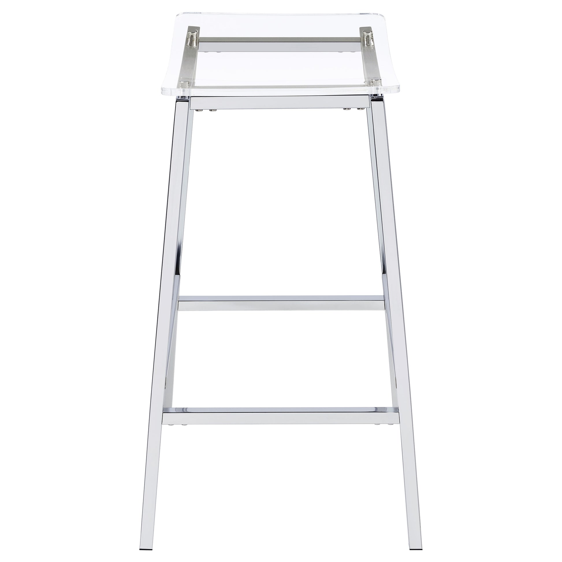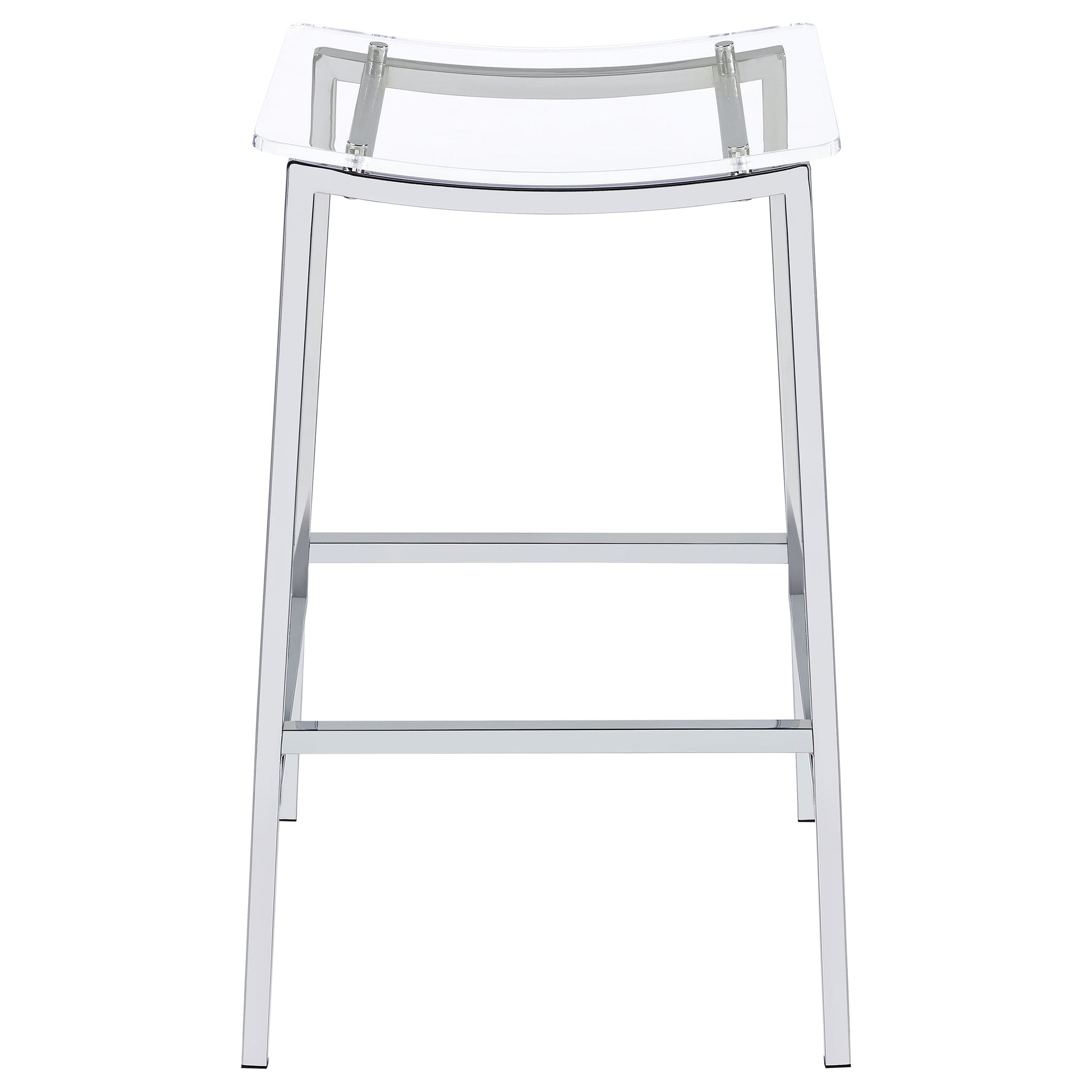 Updated to reflect the carefree contemporary style you crave, this set of two bar stools uses modern materials and finishes to bring a crisp look. Perfect for casual seating at a bar table or counter, these stools are lightweight yet sturdy. Gleaming chrome finish metal framing includes a two-bar seat support and built-in footrests. A gently curved seat made of acrylic reveals the nuts and bolts of metal framing. Add this bar stool set to your easy-living space for entertaining and family meals.