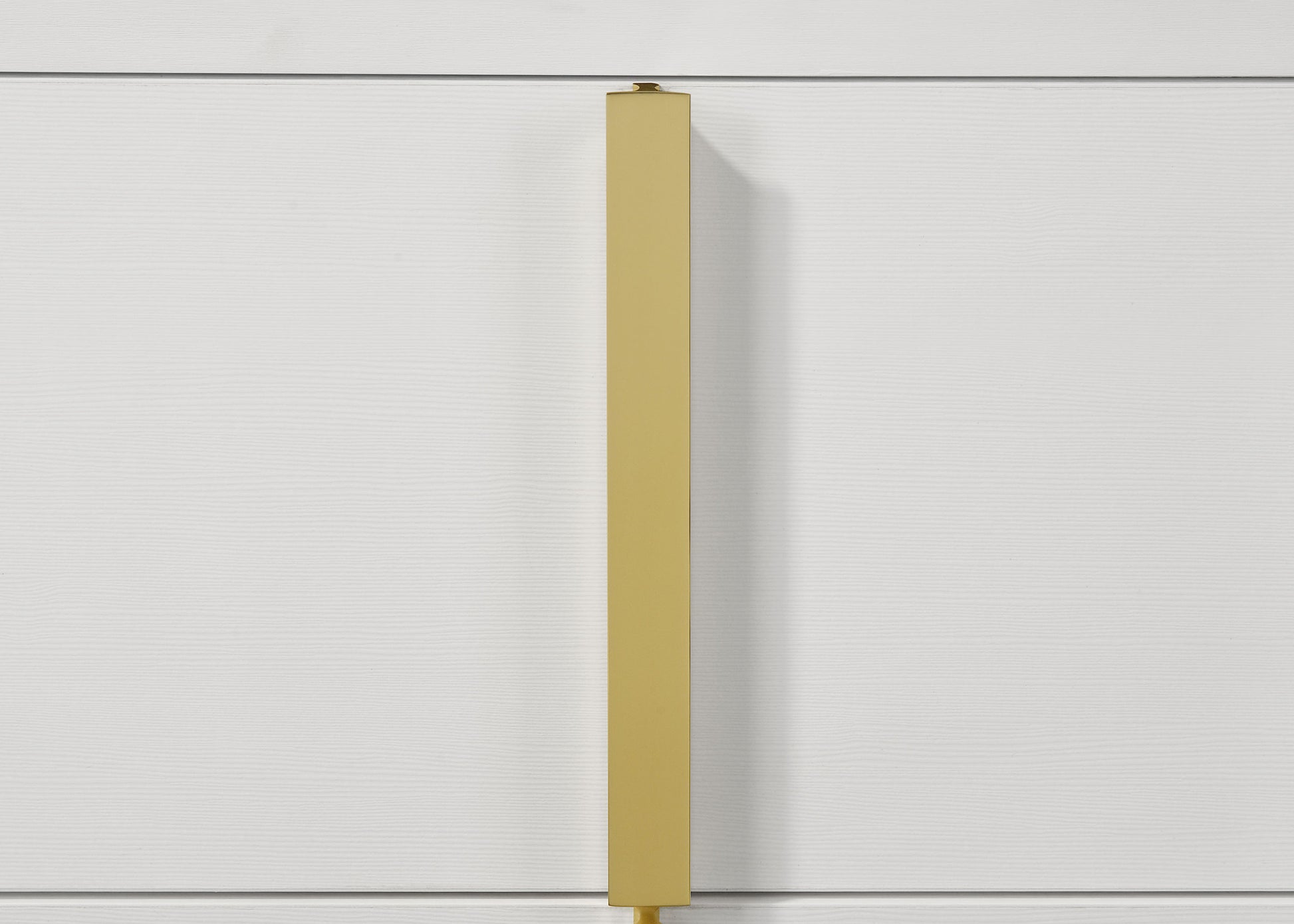 Minimalism never looked so elegant as it does in this elegant five-drawer chest, an excellent option for your updated bedroom ensemble. Modern design details produce a chic vertical chest with an Art Deco vibe and tons of storage space. Made of wood products, this five-drawer chest features a versatile finish with accenting from gold finish metal, placed carefully to emphasize a geometric linear effect. Store incidentals and accessories in drawers operating smoothly on center metal glides. English dovetail drawer construction embellishes this chest’s quality, as vertical gold metal drawer hardware offers a unique impact.