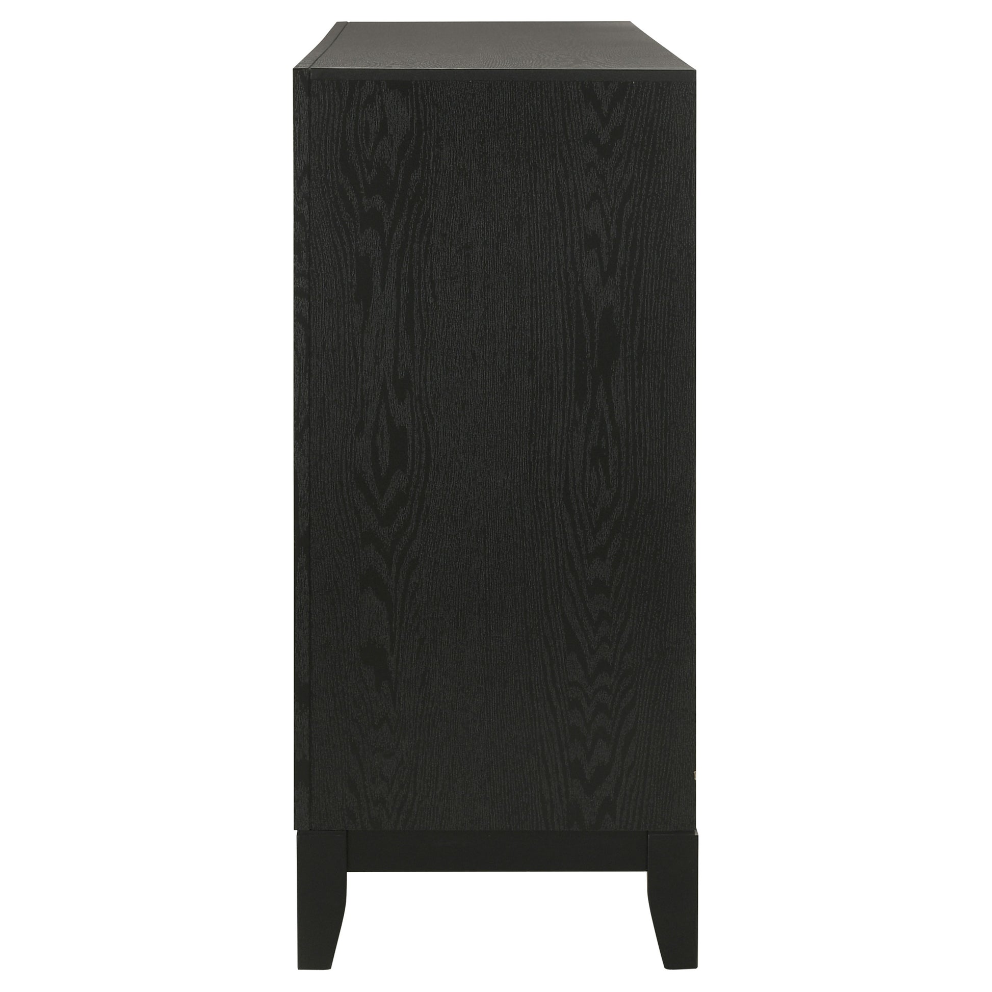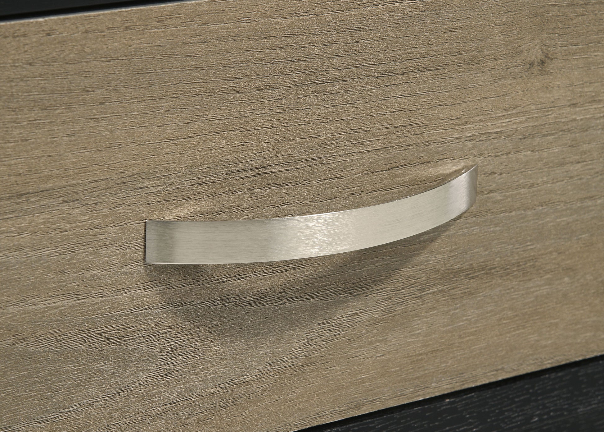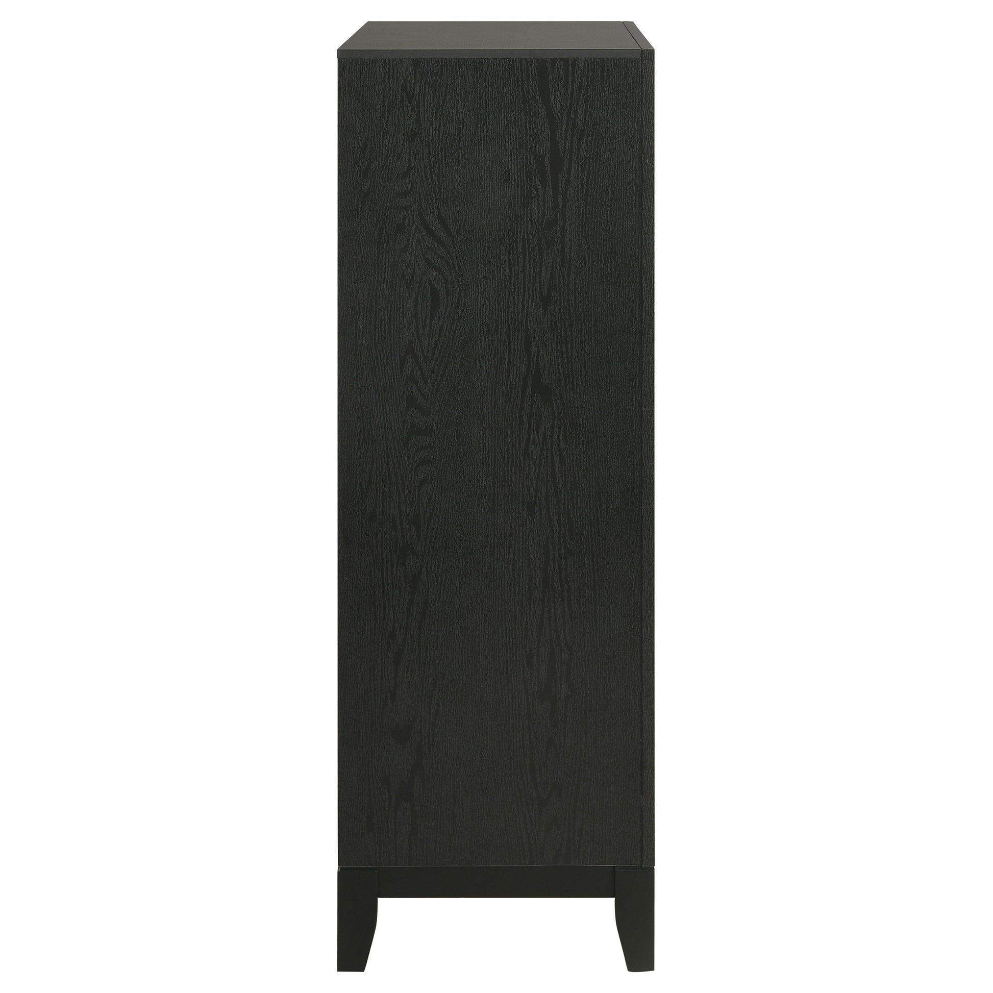 Attention to detail sharpens the decadent look of your modern or transitional master or guest bedroom suite. This artisan-inspired five-drawer chest creates an exceptional look with tasteful and attractive detail. Wood and wood products construction offers a sturdy feel in a chest with a versatile finish duo of black and light brown. Decadent cutout trim on its upper drawer embellishes an already chic look with a tempting geometric pattern. Metal drawer hardware accompanies English dovetail construction and easy opening on Kenlin glides.